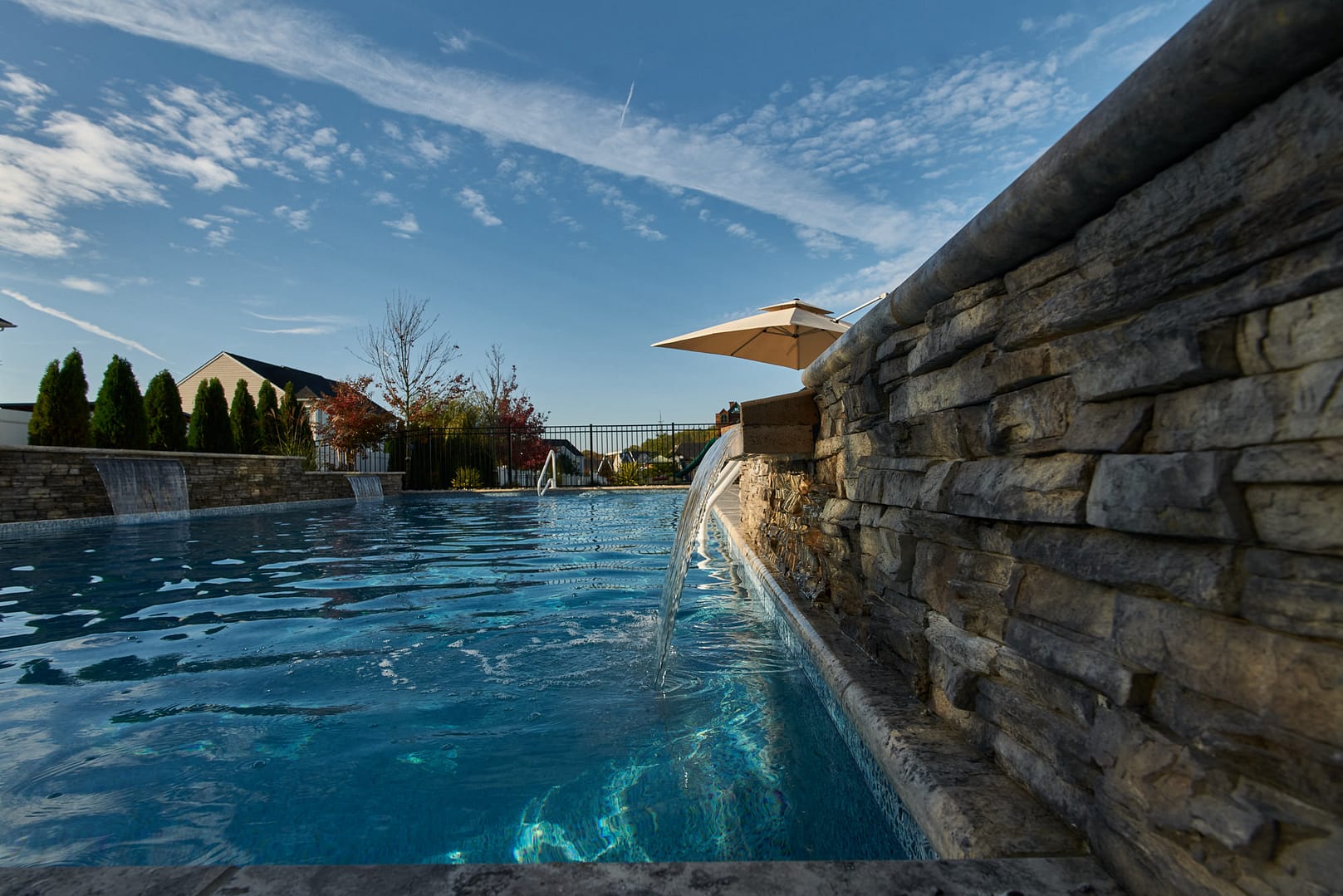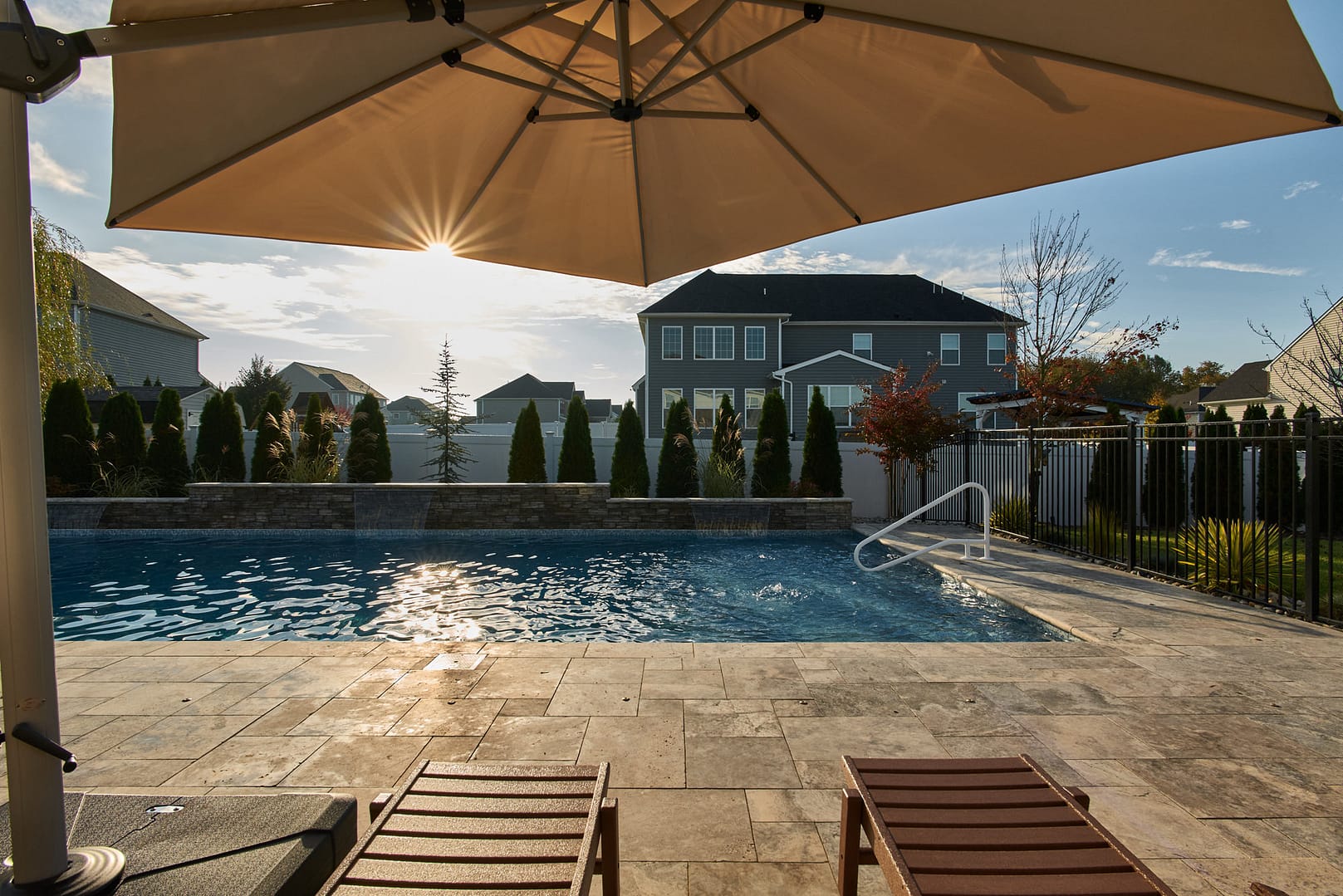 You don’t need to endure a summer drive to the shore to enjoy life in an outdoor WaterSpace. This Mullica Hill family can walk onto the elevated and screened living and dining area attached to their house and enjoy the view of their landscaped pool and spa below. The large dining and living area includes a stone fireplace with large screen TV. An open-air deck and kitchen are located next to the living area. Four steps below is the travertine tile patio surrounding a luxury vinyl pool with an attached spa, lounge chairs, fire pit, and a wall of falling water.