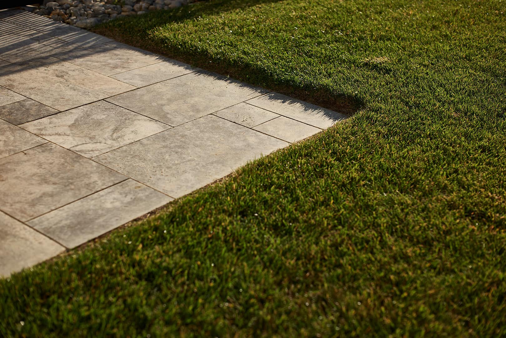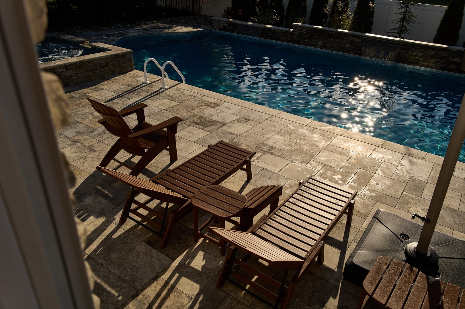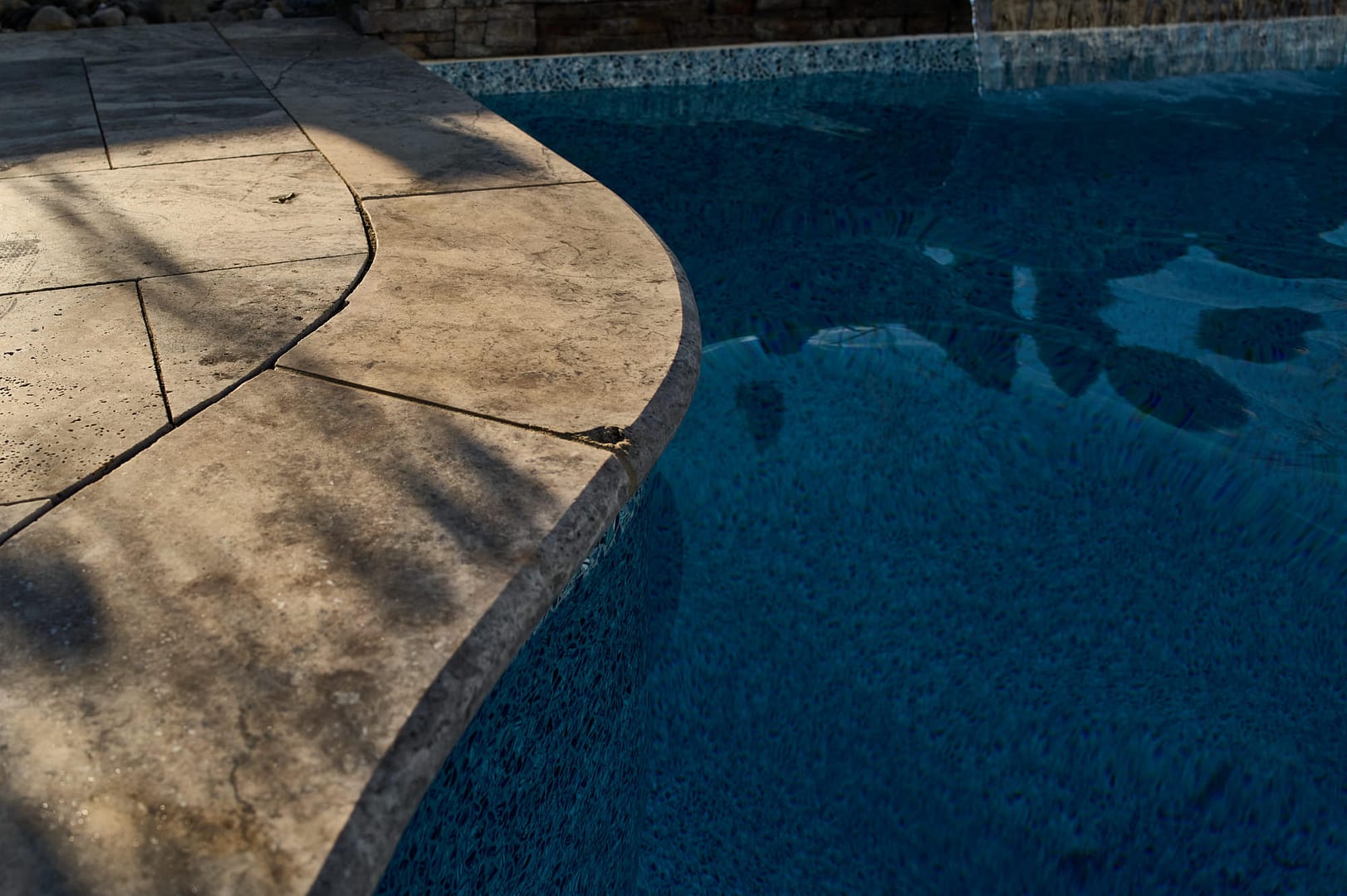 - Travertine coping and tile patio