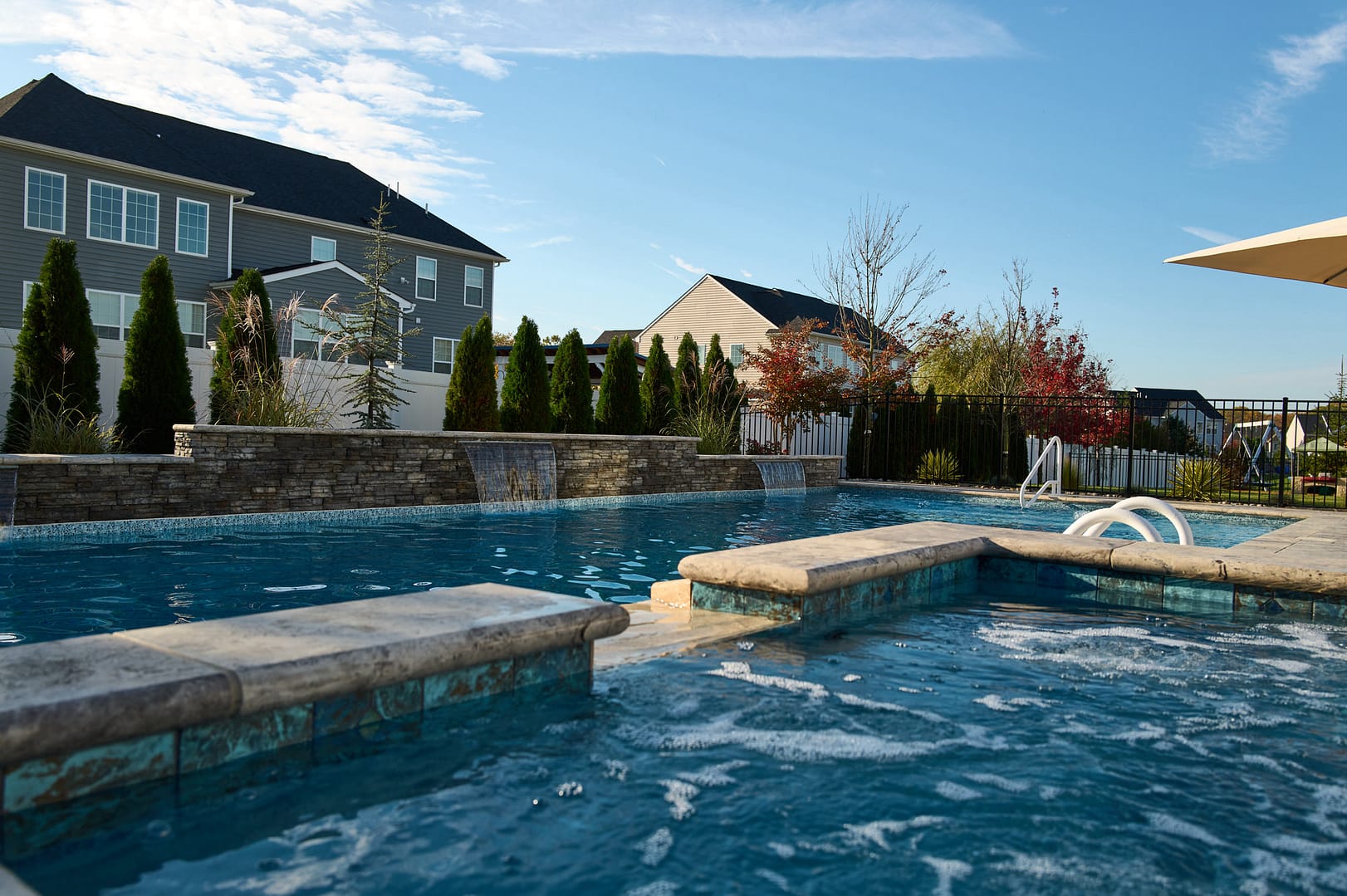 This custom outdoor living space is a time-saving gathering place for family and friends—a “shore alternative” when schedules preclude a trip to the Jersey Shore. The landscaped pool and spa fit the compact suburban backyard, with room for living, entertaining, swimming and relaxing with family and friends.